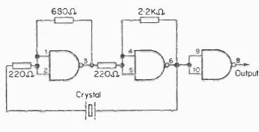 This crystal fundamental frequency oscillator can operate at frequencies up to a few tens of megahertz. The circuit must be powered with 5 V.