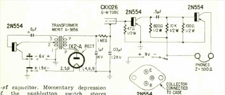 This circuit was published in Radio Electronics magazine in June 1959. The circuit uses an inverter with transformer to generate the high voltage of the Geiger tube.
