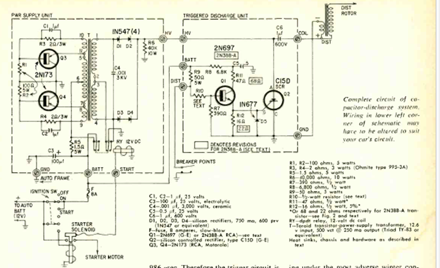 We found this circuit in a Radio Electronics from February 1966. The circuit uses SCR to control an ignition coil containing an inverter to generate the high voltage. This type of configuration has become quite common in this type of ignition since then.