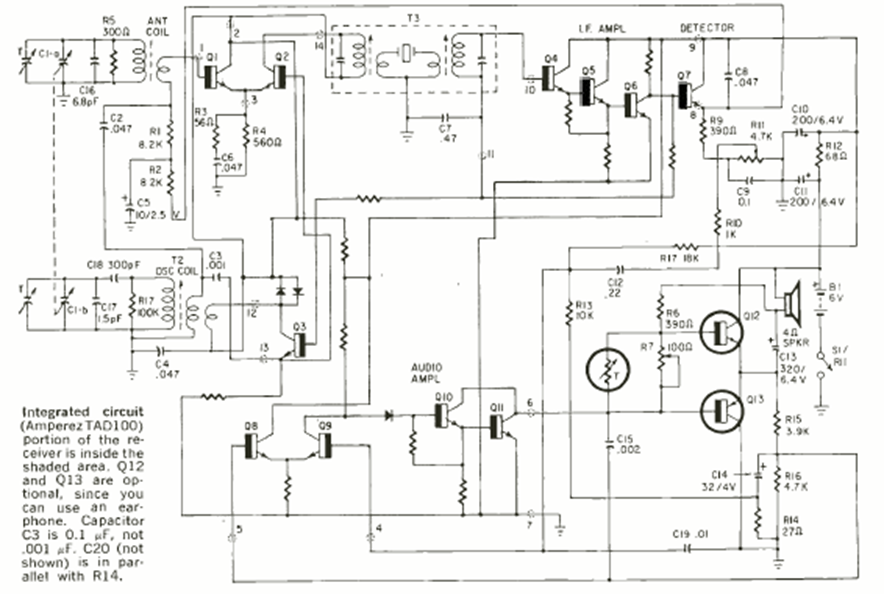 This is one of the first radios with an integrated circuit. The circuit is from a Radio Electronics from November 1969. The circuit is powered by a 9 V battery.