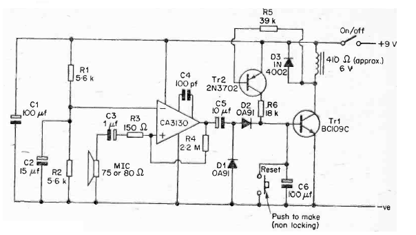 This is the version of the previous circuit with a locking system. The supply voltage is according to the relay. The integrated circuit is the same as the previous circuit, a CA3130. The circuit is from an English publication from 1977.