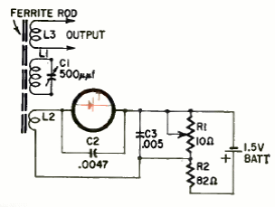 This amplifier circuit is from a 1952 documentation. The frequency of the amplifier signal depends on the coils. Note the low supply voltage.