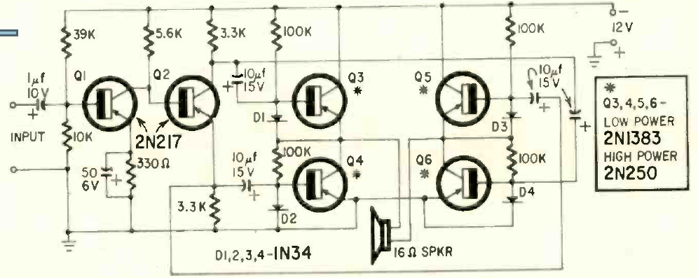 This circuit was obtained from a Radio Electronics from October 1963. The 4 transistors must be according to the power and mounted on heat sinks. Power comes from a 12 V source. Current transistors can be tested.
