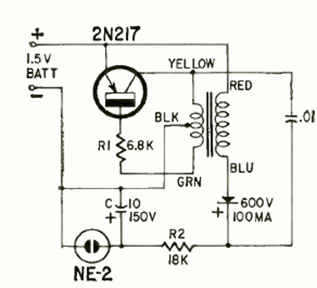 Despite using a neon lamp and being battery powered, this circuit uses a transistor in a high voltage oscillator with a transformer. The circuit is from a Radio Electronics from May 1966.