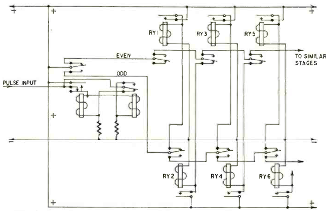 This interesting digital counter with relays with complementary outputs was found in the Radio Electronics magazine of October 1961. The supply voltage is in accordance with the relays used.