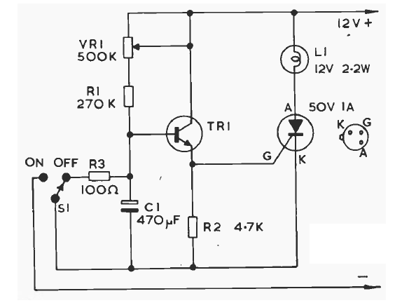 This 12V incandescent lamp switch with time delay was found in old documentation. The SCR can be the TIC106 and the transistor the BC548.