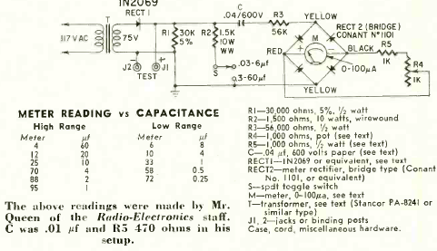 This test for electrolytic capacitors was found in the October 1960 Radio Electronics magazine. Note the voltage applied to the capacitor during the test.