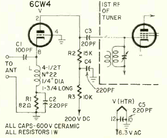 This amplifier for FM antenna signals was published in Radio Electronics magazine in May 1963. Power can be taken from the receiver it works with.