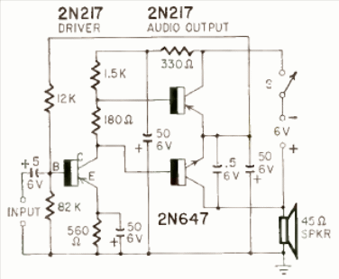 This amplifier circuit was found in a Radio Electronics from April 1959. The circuit needs only 20 mV to provide maximum output power.