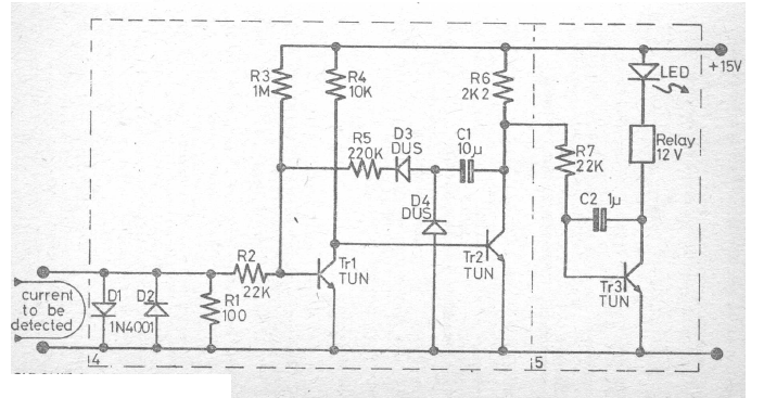 This sensitive circuit for triggering relays was found in an old English publication. It works with alternating signals applied to its input. Transistors are general purpose types.