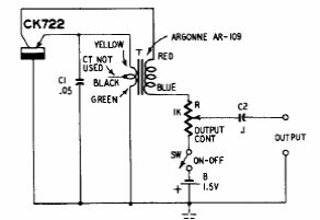 This blocking oscillator was found in a publication from the 50's. The coils determine the frequency. The circuit uses a CK722 germanium transistor.