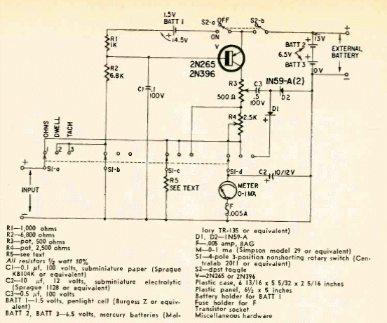 This circuit with transistors of the time was found in the magazine Radio Electroinics of June of 1952. The circuit of 1 transistor is a multi-instrument for analysis of electrical parts of the cars.