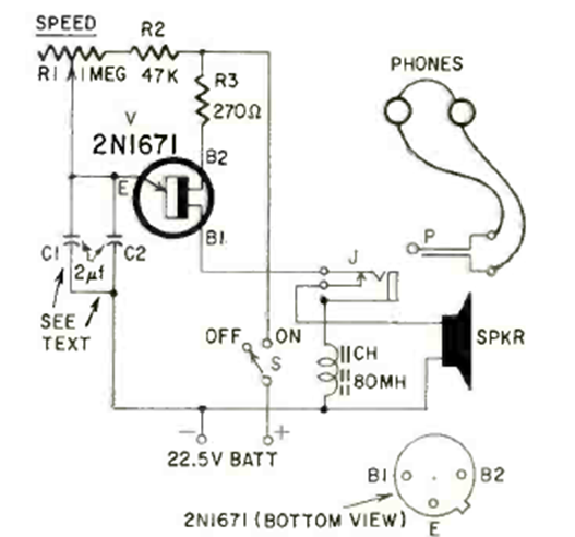 This simple unijunction circuit is from a Radio Electronics from July 1963. It can be assembled with a 2N2646 or another modern unijunction transistor. The headphones are low impedance.