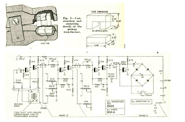 In the figure we have the circuit of a clamp-type microammeter described in the Radio Electronics magazine of February 1960. The circuit also gives information about the magnetic sensor used.