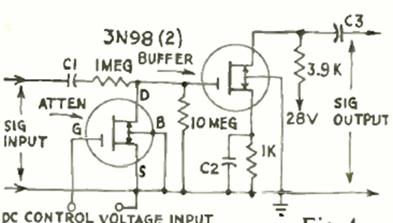 This circuit has its gain determined by the control DC voltage. The circuit is from a Radio Electronics from May 1967. The gain can be adjusted up to 60 dB or 70 dB of attenuation. The transistors are MOSFETs of the time.