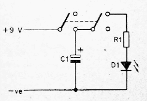 When this circuit is activated the LED flashes for a moment indicating that the function has been activated. The capacitor can have values between 10 and 470 uF.