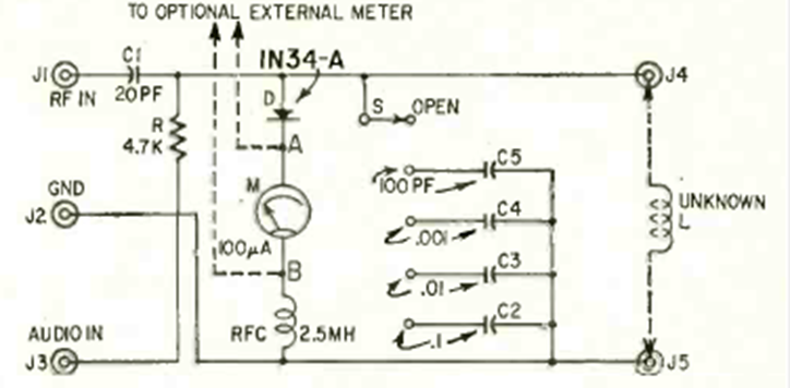 This inductance bridge uses an external audio signal. The circuit is from a Radio Electronics from January 1966. The instrument can be a common multimeter in the lowest current range.
