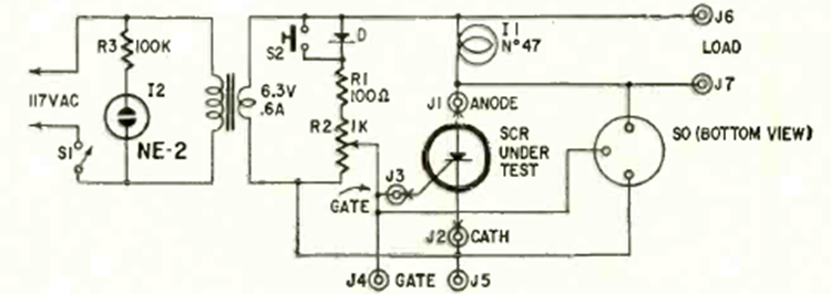 This circuit is from a March 1967 Radio Electronics. The circuit applies to general purpose SCRs such as the TIC106, C106 and others. The test is done by increasing the gate voltage to the trigger point.