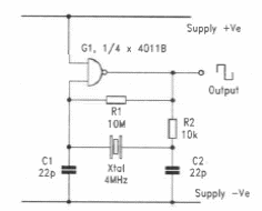 We found this circuit in an old English documentation. The circuit can employ other gates and change the frequency of the crystal.