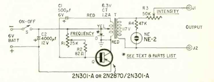 This small battery-powered high-voltage generator was found in Radio Electronics magazine from June 1965. The transformer is the power supply type determining the output voltage,