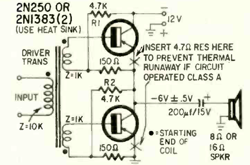 This amplifier stage without an output transformer was found in Radio Electronics magazine from October 1963. The supply is 12 V, and the output is 8 or 16 ohms.