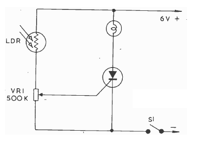 This circuit has an action opposed to the previous one, being activated when the light falls on the sensor. You can shoot with a flashlight. The SCR can be any 106-family member.