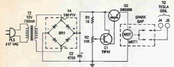 Found in an old Popular Electronics, the sparker is driven by a motor being adapted to the previous circuit. The motor is 1 2V x 5 rpm.