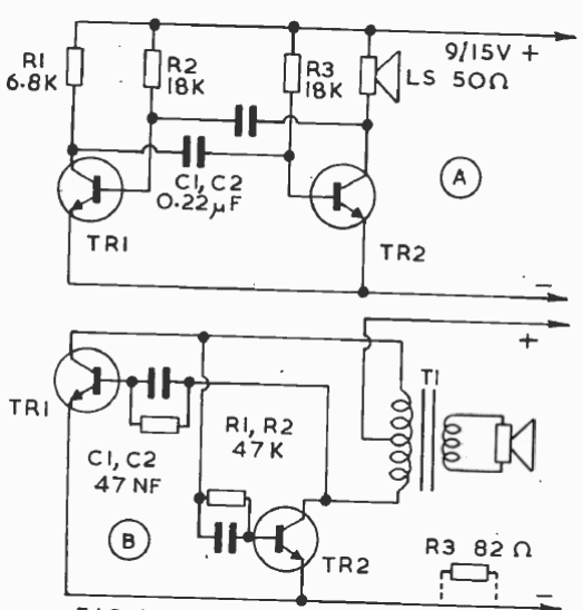 In the figure we have two audio oscillators to be used in small alarms and other devices. The circuit is from an old documentation. Transistors can be the BC548.