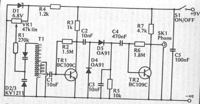 This MW radio circuit with varicap tuning was found in an English documentation from 1989. The transistors can be BC549 or BC549 and the headphone output is for high impedance crystal or magnetic headphones (over 3k).