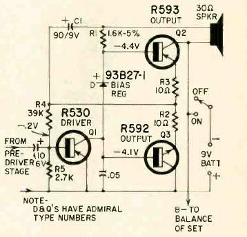 This transistor circuit with complementary output appeared in Radio Electronics magazine in April 1963. The transistors were commercial types at the time, and this stage was used in a common radio.