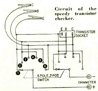 This simple transistor test circuit was found in Radio Elecronics magazine from October 1961. It works for both NPN and PNP transistors and uses toggle switches.