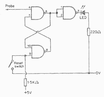This TTL circuit with the 7400 serves as a pulse indicator. It must be supplied with a voltage of 5 V.