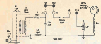 This is a basic version of the Tesla coil that does not use semiconductor devices, found in an old Popular Electronics. The circuit uses a transformer of the type used in old 3kV neon signs.