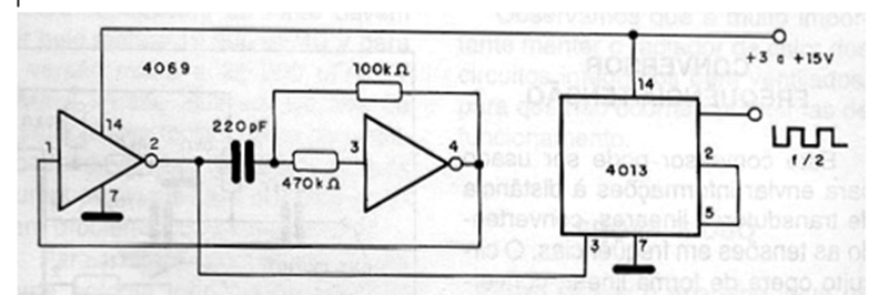 This circuit allows the frequency generated by an oscillator with the 4069 to be divided by two, with an output signal maintaining an active cycle of 50%. This symmetry is important when the circuit is used in digital mixers, multiplexers, as clock echo chambers or digital delay lines. For the 4069 circuit, only two of the 4 available ports are used while for the 4013, only one of the flip-flops of this integrated is used in the circuit.