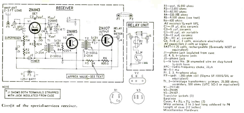 The figure shows a remote-control receiver working the 27 MHz band, very popular in the 60’s. The circuit us from a February 1961 Radio Electronics magazine.