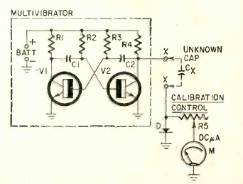 This simple two-transistor capacitance meter uses a 50 uA microammeter as an indicator instrument. The circuit is from a Radio Electronics from June 1961.