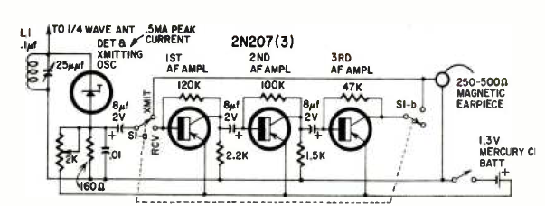This simple 3-transistor circuit for short-range headphone listening was found in a Radio Electronics from November 1962. The headphone also works as a microphone.