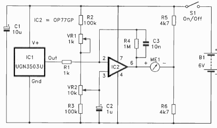 We found this circuit in an English documentation from 1995. The Hall sensor used is from the time and the operational amplifier could be the 741.