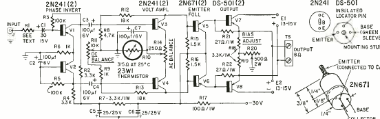 This amplifier was published in Radio Electronics magazine in September 1959. The 8-transistor circuit does not use an output transformer and is powered by a voltage of 13 to 15 V.