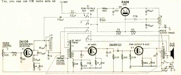 This is Heathkit's CW-30, a miniaturized 4-transistor receiver for the citizen band or 11 meters. The circuit appeared in Radio Electronics magazine in June 1961. Power was supplied by a 9V battery.