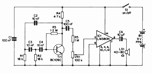 The audio signal generated by the oscillator stage is amplified by an LM380 and reproduced with good volume in a loudspeaker. Equivalent general-purpose transistors can be used.