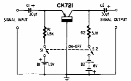 This circuit is from an American documentation from the 50's. The transistor is the CK721, and the power is supplied by two batteries. Input impedance is low.