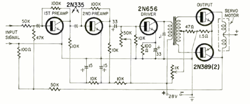 This circuit is from a Radio Electronics from July 1965. The circuit uses components from the time also controlling a servo from the time. The power supply is 28 V.