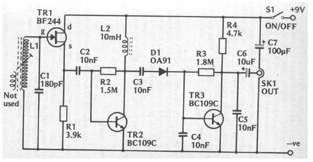 This circuit tunes MW radios to apply the signal to a good audio amplifier. The circuit is from an old documentation. Transistors are general purpose types.