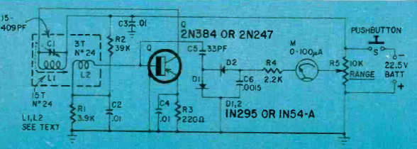 This transistorized “grid dip” oscillator was found at Radio Electronics in June 1953. The 1-transistor circuit was described in an article with several coils for different frequency ranges.