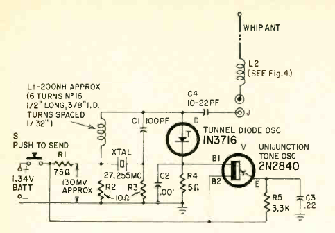 This circuit was found in Radio Electronics magazine from June 1963. The range is small and the frequency is 37.355 MHz. The circuit is powered by a single 1.34 V battery.