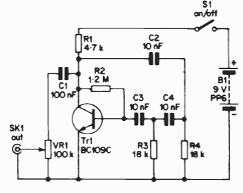 Capacitors C2, C3 and C4 determine the frequency of this simple oscillator. Transistor can be general purpose equivalent.
