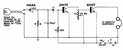 This circuit is from an American publication from the 1960s. The circuit monitors modulated transmissions from a nearby transmitter. The transistor is germanium.