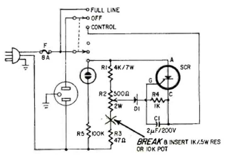This circuit with SCR is from a Radio Electronics magazine from September 1965. It is a commercial control from Heathkit for controlling universal motors.