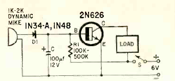 This sonic switch, vox or sonic relay uses a Darlington of the time that has a gain of 10,000. The circuit appeared in Radio Electronics magazine in June 1961. The relay depends on the power supply.